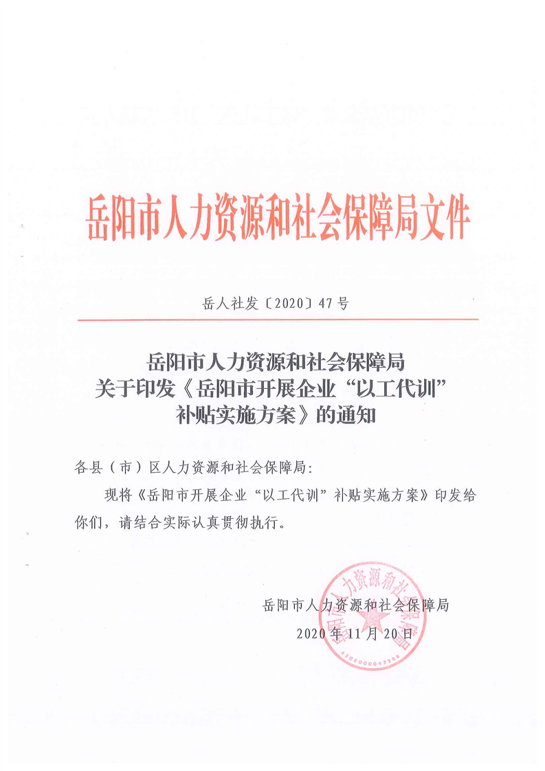 岳阳市以工代训实施办法(岳人社发【2020】47号)