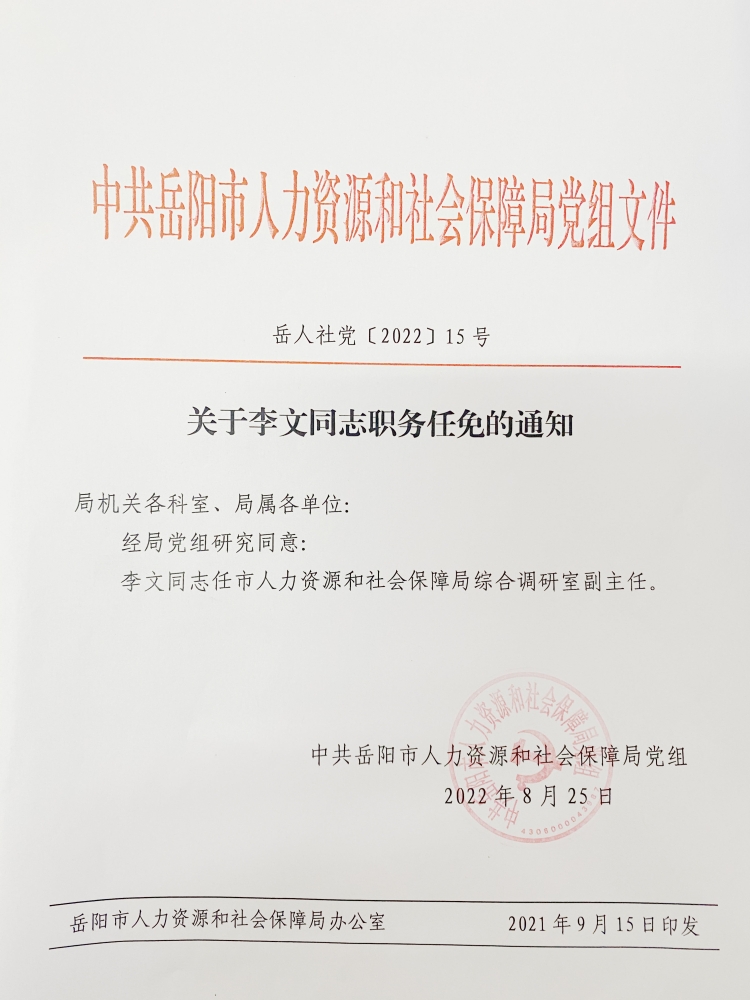 关于李文同志职务任免的通知