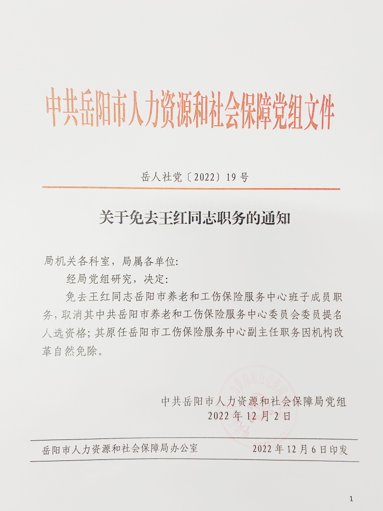 关于免去王红同志职务的通知