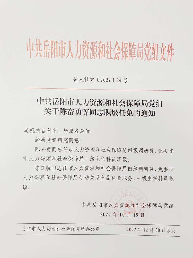 中共岳阳市人力资源和社会保障局党组关于陈奋勇等同志职级任免的通知