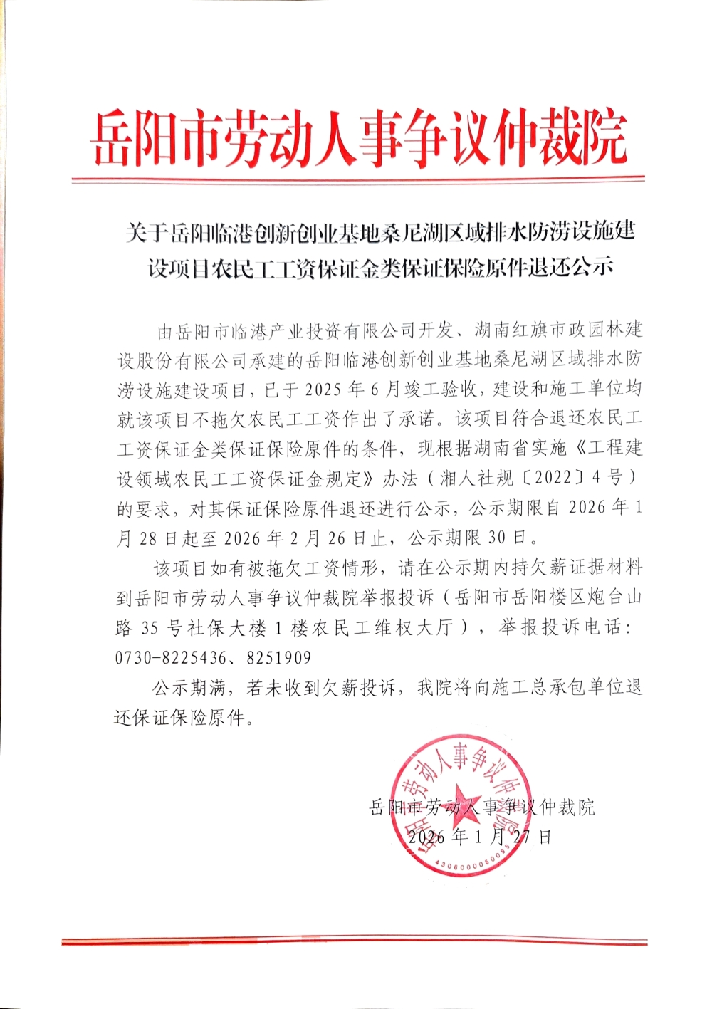 关于岳阳临港创新创业基地桑尼湖区域排水防涝设施建设项目农民工工资保证金类保证保险原件退还公示