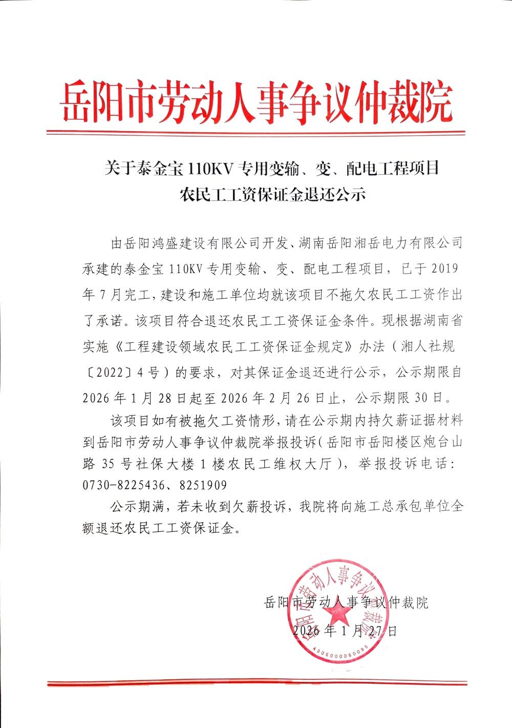关于泰金宝110KV专用变输、变、配电工程项目农民工工资保证金退还公示