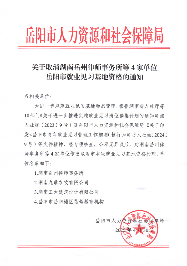 关于取消湖南岳州律师事务所等4家单位岳阳市就业见习基地资格的通知