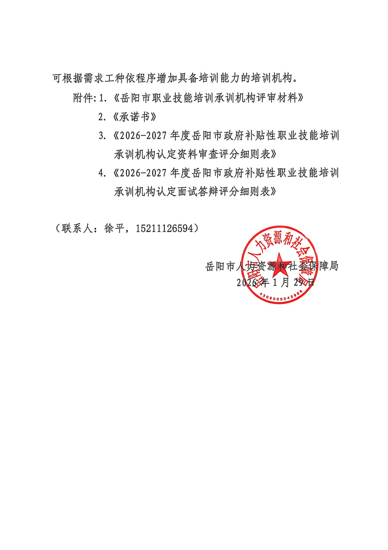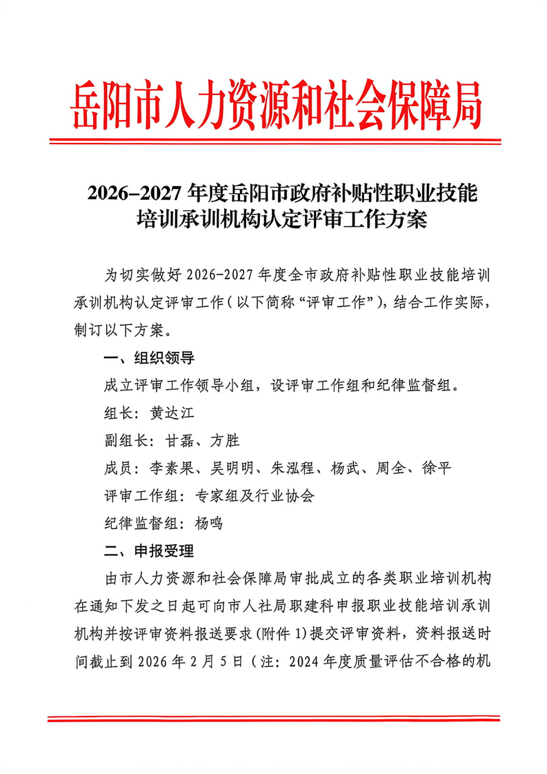 2026-2027年度岳阳市政府补贴性职业技能培训承训机构认定评审工作方案