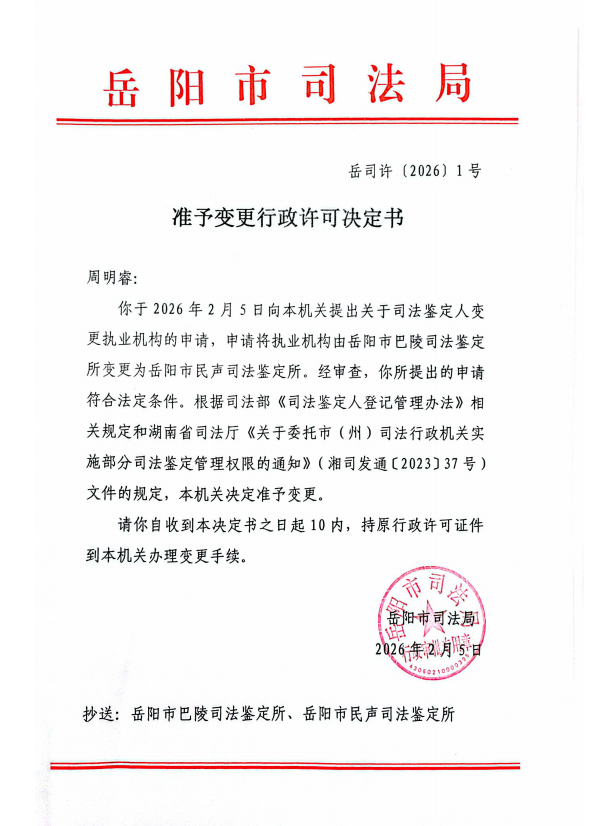 准予变更行政许可决定书(岳司许[2026]1号)