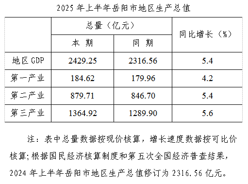 根据地区生产总值统一核算结果,2025年上半年岳阳市地区生产总值2429.25亿元,按可比价格计算,同比增长5.4%。分产业看,第一产业增加值184.62亿元,增长4.2%;第二产业增加值879.71亿元,增长5.4%,第三产业增加值1364.92亿元,增长5.6%。
