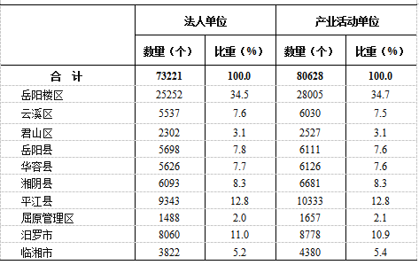 2023年末,在第二产业和第三产业法人单位中,位居前三位的地区是:岳阳楼区25252个,占34.5%;平江县9343个,占12.8%;汨罗市8060个,占11.0%。