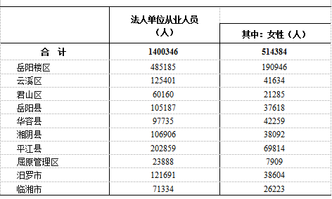 2023年末,在第二产业和第三产业法人单位从业人员中,位居前三位的地区是:岳阳楼区48.52万人,占34.6%;平江县20.29万人,占14.5%;云溪区12.54万人,占9.0%。