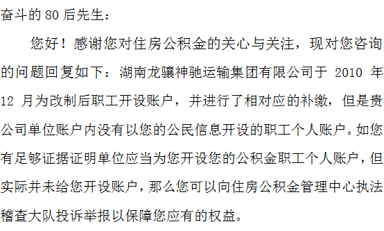 | 再次回复: | 奋斗的80后先生: 您好!感谢您对住房公积金的关心与关注! 就您咨询的住房公积金事宜现予回复:因您原单位在2010年改制,改制后原单位国有企业已不存在,现神驰集团是改制后的新法人,属于私企股份制的性质,也因您现在并非神驰集团的职工,所以神驰集团没有给你补缴的义务。您可以去神驰集团咨询一下,看当初单位改制时,对公积金问题双方是否达成什么协议。 |
