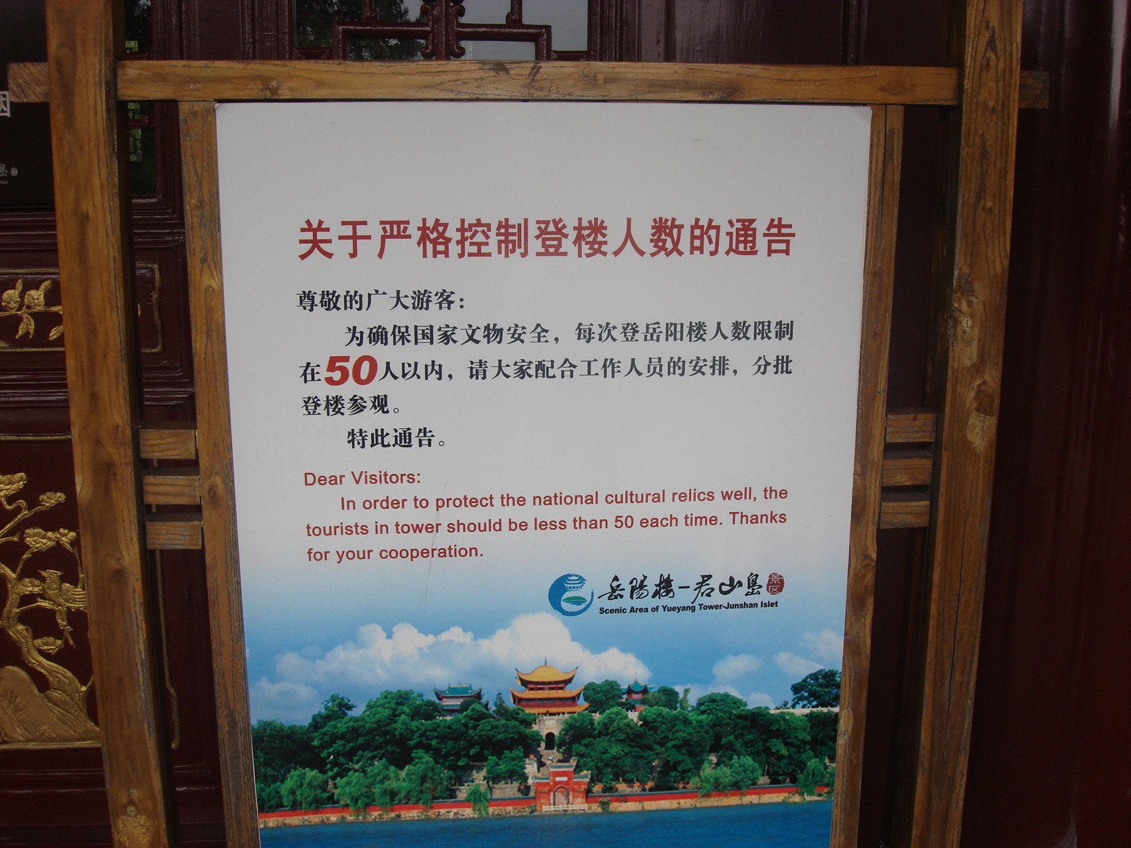 十月份,我是作为一名散客去的岳阳楼,在参观期间,陆陆续续地来了很多旅游团队,明明楼下有个牌子,写着:“……每次登岳阳楼的人数限制在50人以内……”但不见有工作人员把关,以至于人数大大超出,每当有几个旅行团一起拥来的时候,二楼三楼之上,每层都不止50人,严重超载了。希望这一点,公园方面要尽快改正过来。岳阳楼是江南三大名楼之中的唯一古建筑,实属难得!不要毁于我们这一代人的手中啊,要对得起祖先,也要对得起后代!让它永远都传承下去吧! 附件1:DSC07600.JPG |