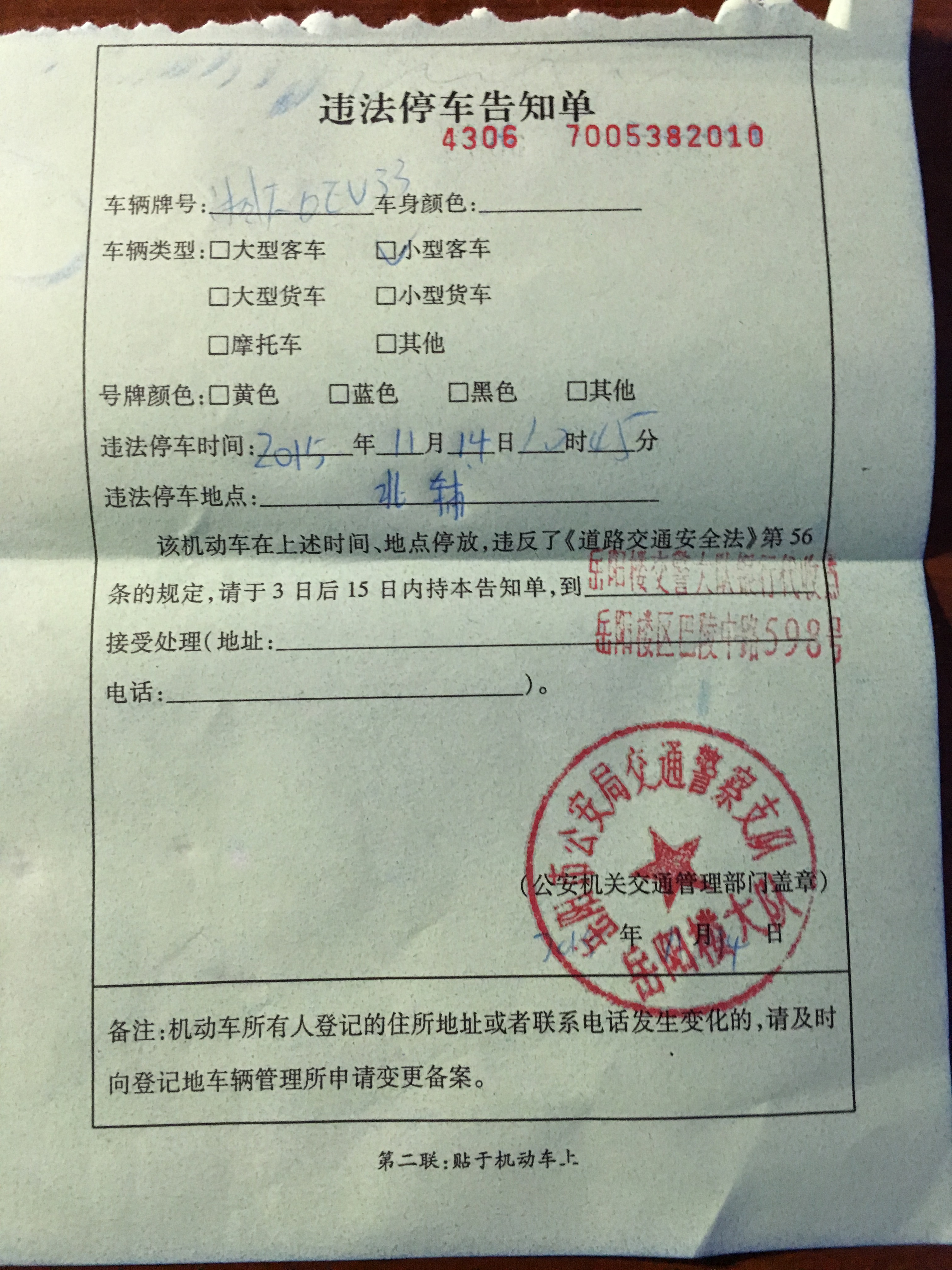 市长, 周末好! 昨日(14号,周六)上午10:30许至11:20分,本人驾驶湘F0EV33小车到步行街武商百货购物,将车停靠在步行街北辅道武商后门斜对面的右侧(以自东向西单向行驶为方位)白色停车线内;此时右侧及对面的左侧(按通常情形应为逆向停车)均停满各类私家车。半小时后上车发觉挡风玻璃上的罚单(见附件2),下车查看其它车辆处罚情况,除极少数被抄牌外,包括逆停车辆和停靠在白线框内、且无驾驶人员在车内的其它车辆大多无罚单,同时,事前事后均未见1交警在现场劝导。 此类情形还包括在城区的土桥、炮台山、沃尔玛超市图书城、还有火车东站等地段,车友们大多抱怨,交警只抄不劝,往往下车后不久神不知、鬼不觉地被抄了;甚至,有的地段(如南湖大道市建行、华天酒店等停车场内)环卫“执法”(清扫员)人员也对未划线空地、或车头车尾稍超出线内(根本不影响人行道和盲道正常步行下)的停放车辆拿着票据开口罚50元,一般人经不起瞎磨扔下10-20元走人。 如果此事发生在11月9号或以前,本人就不多言了,因为,停白线、还是停蓝线还是分得清楚的,但本人作为比较关注地方政事的市民,11月9号《岳阳日报》就政府方面缓解“停车难”所做出的举措,多少让我有点“好雨知时节”的小感动;虽说,比起长沙、株洲等地级市晚了许多,但作为民生工程还是得到了应有的重视。 为此,特写下以上信件,希望政府令出必行;同时,重要的是,在其治下一定管束好相关执法部门。 |