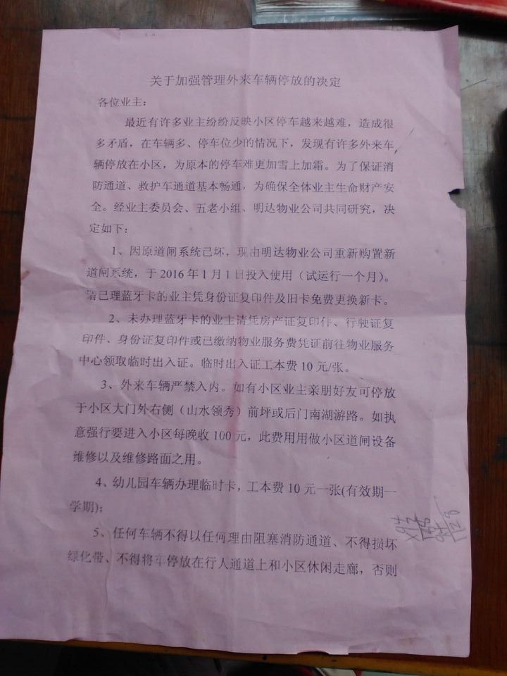 | 内容: | 尊敬各位领导您好,我是湖畔新村的一名住户,在2015年发布“关于加强管理外来车辆的停放的决定”,发布“决定”在物业处无法得知收费依据,所以特此向政府部门寻求答案。 1、“决定”上未注明具体钱数。在业主前往物业交钱时,询问具体收费标准依据,其工作人员一概不知。询问很多实际问题,物业工作人员也不能解决该问题。只收费,不回答。 2、“决定”上说明是通过小区业主委员会的商讨决定。但是其“决定”并不符合我小区具体情况,并不能实际解决小区停车难的问题。第一、小区实际车位并不够每户一个停车位。第二、小区每户并不只有一台车辆。第三、小区住户有亲人、亲属车辆临时停放并没有解决。 3、“决定”上把小区停车难得问题归结于外来车辆的问题,我觉得根本就不是根本原因。以此原因收费,太过牵强。 4、小区内幼儿园车辆临时卡,只需10元一张,有效期都是一学期。而本小区居民费用却高达310元(只有收据)。 5、本人觉得我身为该小区业主,在购房时就已经出了公摊费用,再停车不该另外收取管理费用,而物业收取该项费用后,也不能保证我们的车辆不受损害。而且每年我们也出了物业管理费。 6、收取费用,并没有注明该项费用对应的服务内容。业主缴纳费用也只是能够进入小区而已。而且该项费用也并没有进行公示。 综上所述,该项“决定”作为业主我既没参与,也没有得到应有的知情权,而物业只用沉默来代替,业主怕其车辆进不来,许多业主被迫支付该项费用。 另外听以前有车的业主说,以前也办理过两次该业务,但也并没有实行很久。 我希望相关领导可以核实并且帮我们解答疑问。谢谢! 附件1:uploadfiles/201602/20160201155250804.jpg |