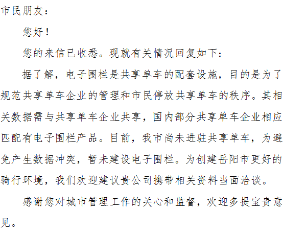 | 内容: | 尊敬的岳阳市人民政府: 为了进一步规范管理共享单车,广东亦强科技有限公司以《关于鼓励和规范互联网租赁自行车发展的指导意见》(交运发〔2017〕109号)为指导,向岳阳市人民政府提出申请,由我公司全额出资,在岳阳市建设公益性共享单车电子围栏。如获批准,我们将于2017年底建设2000个共享单车电子围栏,并力争在2018年6月,将共享单车电子围栏覆盖岳阳市。协助政府规范管理共享单车,让共享单车更好地为人们提供出行服务,并助力城市交通的建设与发展。 公司简介及公益性电子围栏建设等相关情况附后。 专此请示,盼复。 广东亦强科技有限公司 2017年10月 |