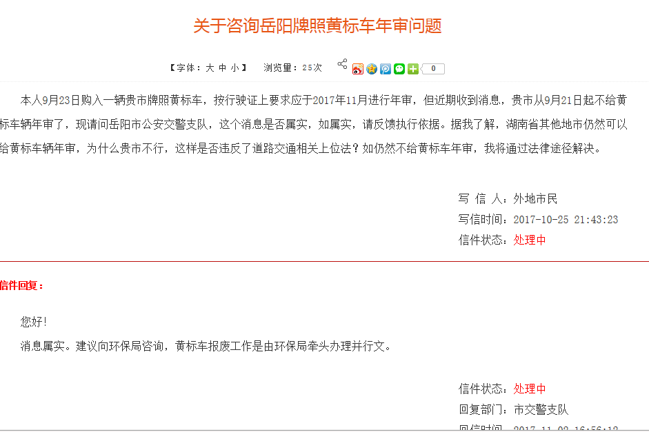 | 内容: | 本人9月23日购入一辆贵市牌照黄标车,按行驶证上要求应于2017年11月进行年审,10月25日我通过市长信箱咨询了岳阳市公安交警支队,支队反馈关于不予黄标车年审的文件是市环保局行文的。对这个反馈我不满意。首先车辆年审是交警支队的工作,并不是市环保局来年审及报废,交警支队这样回应就是在踢皮球。其次我国已取消“黄绿标”,为什么贵市仍然出台文件限制黄标车年审?根据我国道路交通安全法第13条之规定:只要提供车辆购强制责任险单及行驶证,应予以年检。现在贵市环保局出台文件并要求交警支队不给黄标车年检,与道路安全法等上位法相违背了。如仍然不给黄标车辆年检,我将立即发律师函并通过司法途径上诉。 |