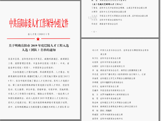 岳阳市2019年度巴陵人才工程入选人选(团队)名单于2月27日公布,岳阳楼区文化馆副研究馆员、文学专干李海英,美术专干张雯,双双入选巴陵文艺新闻人才。