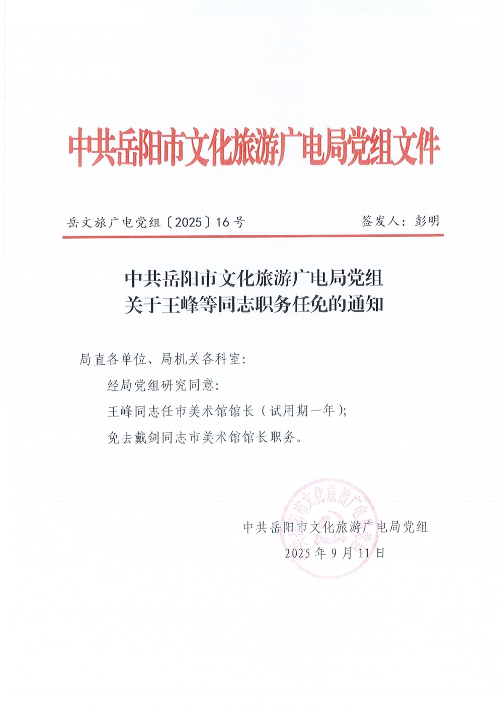 关于王峰等同志职务任免的通知(岳文旅广电党组〔2025〕16号)