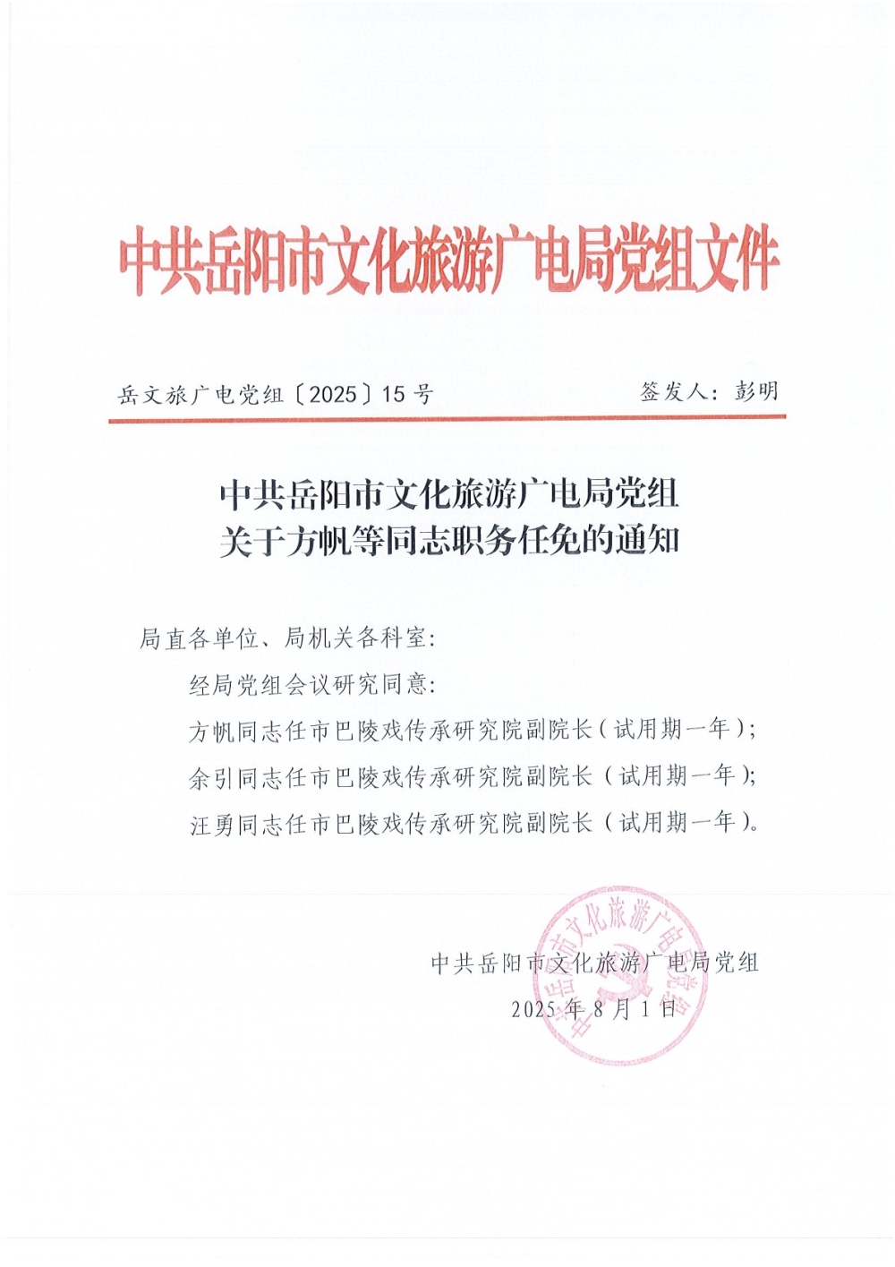 关于方帆等同志职务任免的通知(岳文旅广电党组〔2025〕15号)