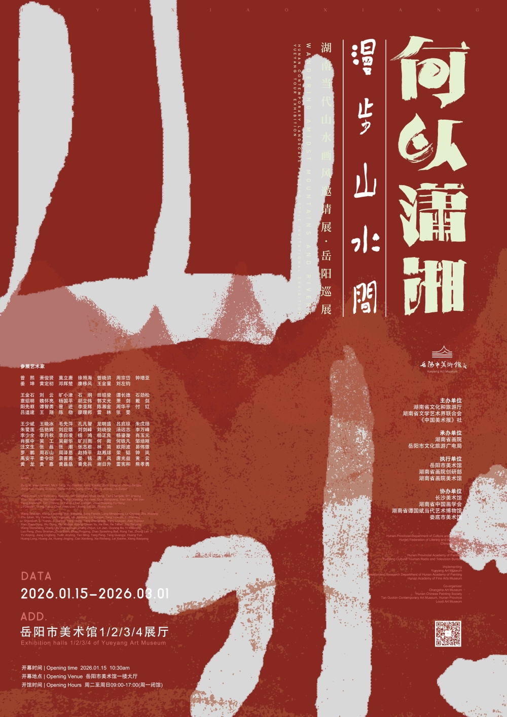 岳阳作为潇湘大地上的文化重地,“衔远山,吞长江” 的洞庭湖与“先天下之忧而忧”的岳阳楼相映成辉,历来是文人墨客寄情抒怀之地,也是“漫步山水间”艺术实践的重要站点。此次巡展是“何以潇湘——漫步山水间”长沙首展后的重要延伸。我们遴选了96位艺术家的130件精品力作。展览分“文脉经典”“中流砥柱”“厚积薄发”三大板块,旨在立体呈现当代湖南山水画创作的代际传承与整体风貌。“文脉经典”板块,以经典作品为引,勾勒出湖南山水画艺术的精神源流。该板块通过几代老艺术家的创作,侧面映照出湖湘山水美学在百年流变中的积淀与传承。“中流砥柱”板块,集中展示了当代湖南山水画创作中坚力量的艺术成果。这些作品清晰地勾勒出在继承传统精髓与融汇现代意识之间探寻新路径的创作活力与丰硕实绩,构成了当下湖南画坛承上启下的核心力量。“厚积薄发”板块,则聚焦于充满活力的新生代及骨干艺术家群体。他们的艺术实践体现了对地域山水意象的深入探索与多元表达,既生动反映了湖南山水画坛百花齐放的包容气象,更让人深切感受到其厚积薄发的蓬勃态势与未来发展的无限潜力。