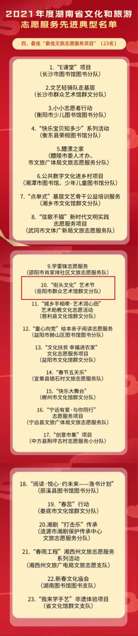 3月8日,湖南省文化和旅游厅在官网公示了2021年度湖南省文化和旅游志愿服务先进典型名单,岳阳市群众艺术馆喜获佳绩:馆支部副书记袁雄斌荣获“最美文旅志愿服务组织工作者”称号;文旅志愿服务品牌项目“街头文化艺术节”获评“最佳文旅志愿服务项目”。