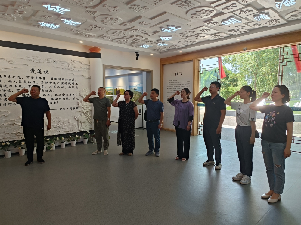 在廉洁文化园,党支部书记、市群众艺术馆馆长周磊带领党员集体重温入党誓词,群艺馆新预备党员李聪在党旗下宣誓。
