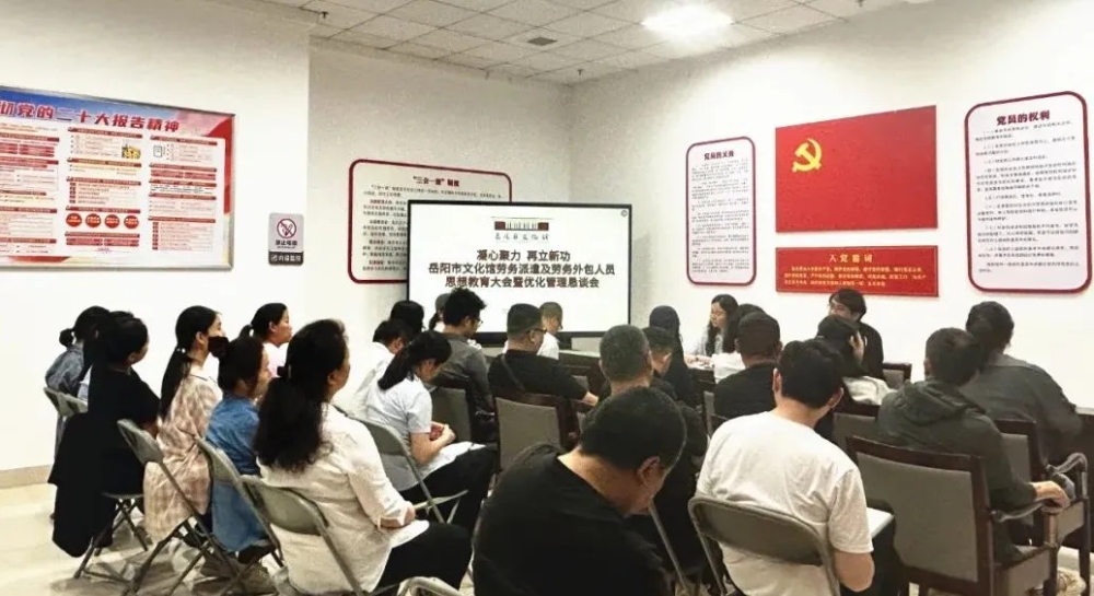 8日,岳阳市文化馆劳务派遣及劳务外包人员思想教育大会暨优化管理恳谈会召开。全馆二十余名劳务派遣及劳务外包人员和办公室、动力技术部、剧场会务部负责人参会,副馆长刘霞主持会议,馆长袁思奇向劳务派遣及劳务外包员工进行思想教育并就如何优化管理与员工恳谈。