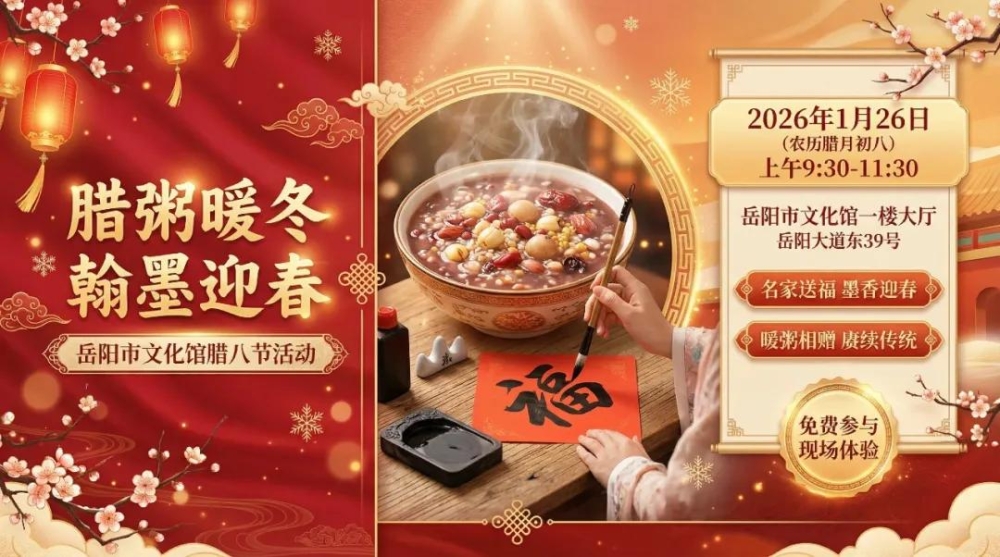 腊八至,年味始。在这一元复始、祈福迎祥的传统节日里,岳阳市文化馆精心策划“腊粥暖冬·翰墨迎春”主题活动,面向公众开放,诚邀广大市民、游客朋友一同来馆,感受笔尖下的年味与舌尖上的温情。