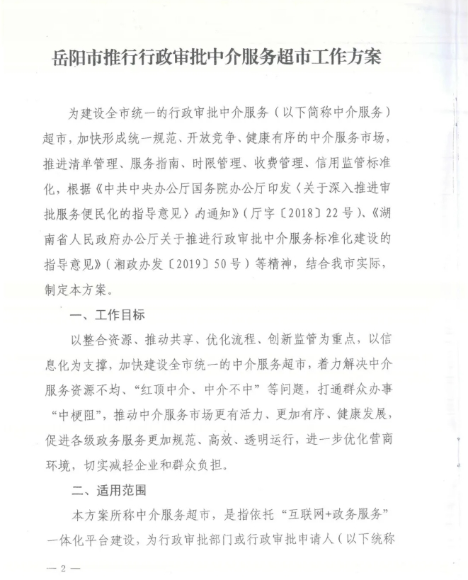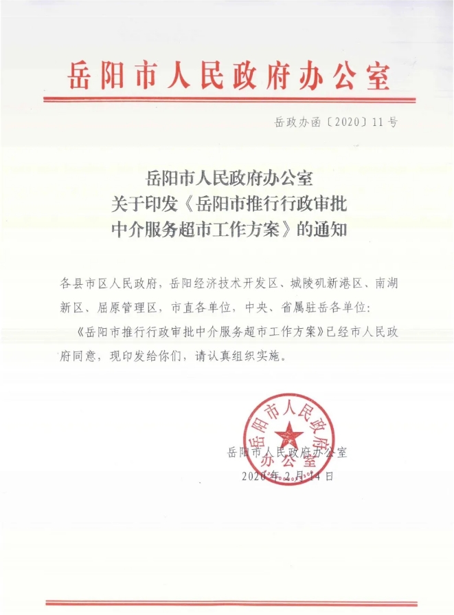 岳阳市人民政府办公室关于印发《岳阳市推行行政审批中介服务超市工作方案》的通知(岳政办函〔2020〕11号)