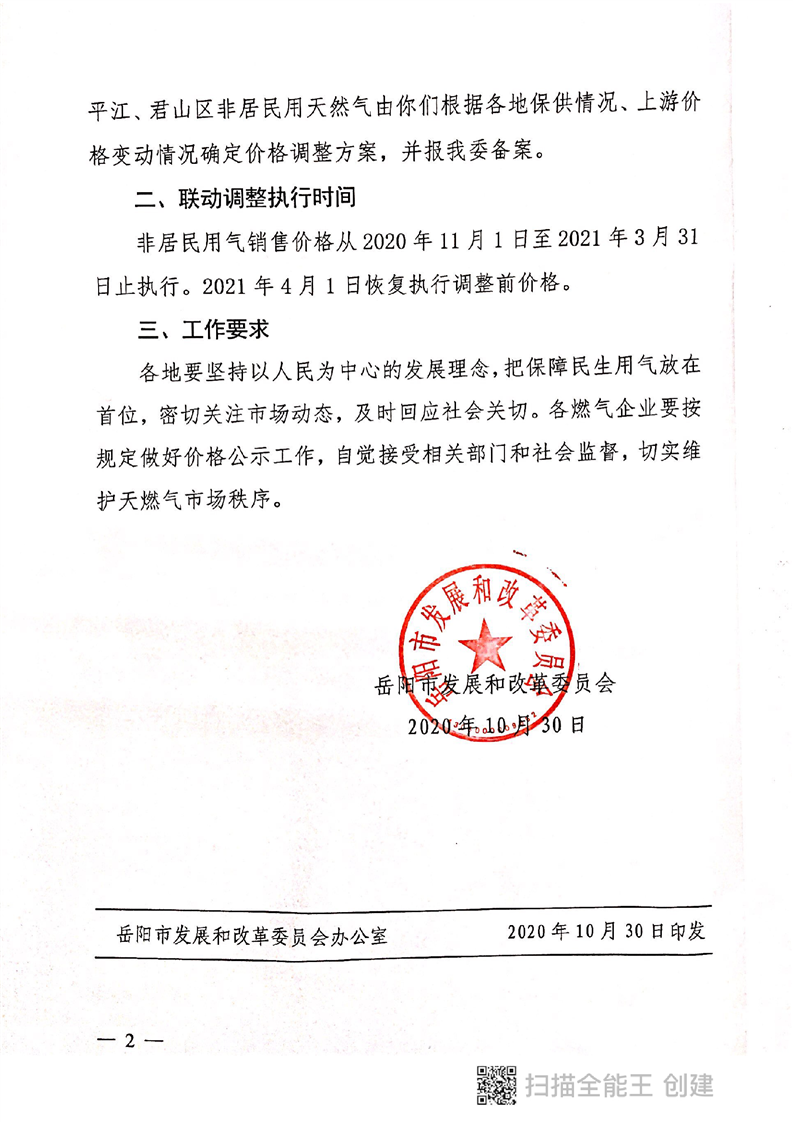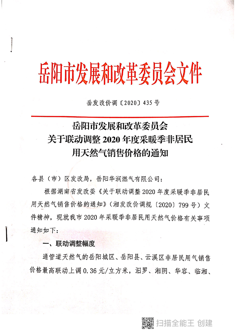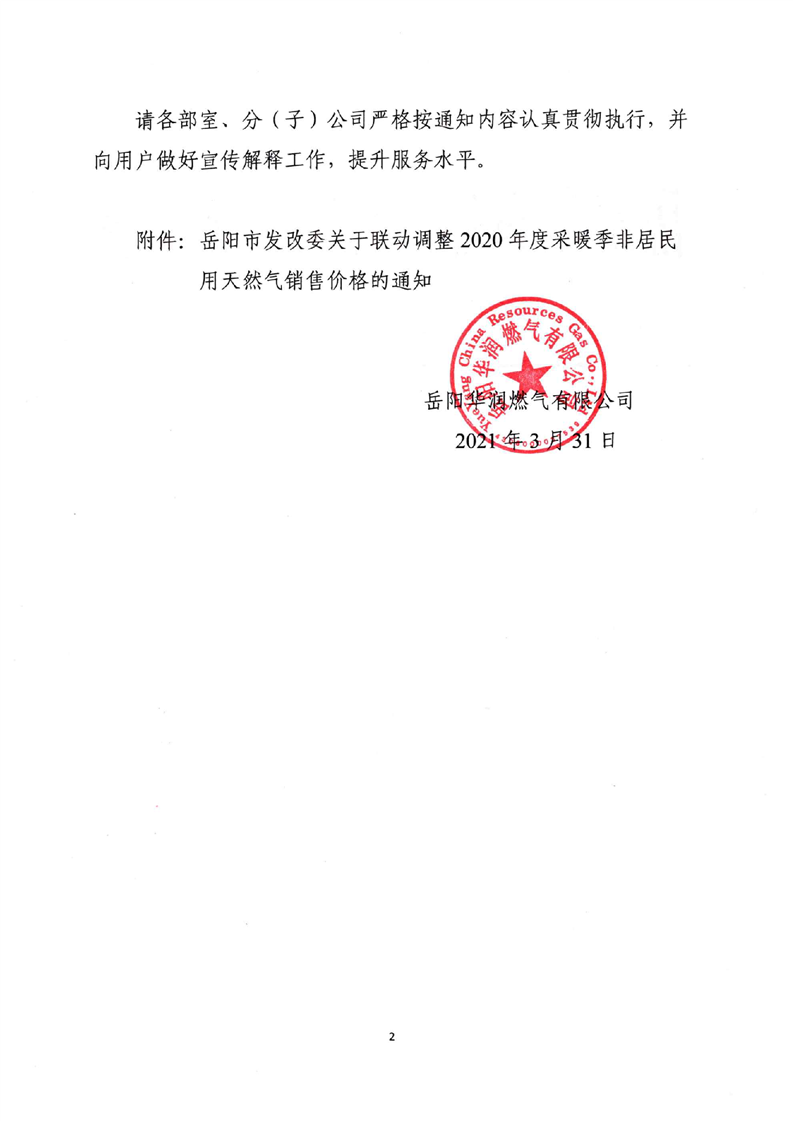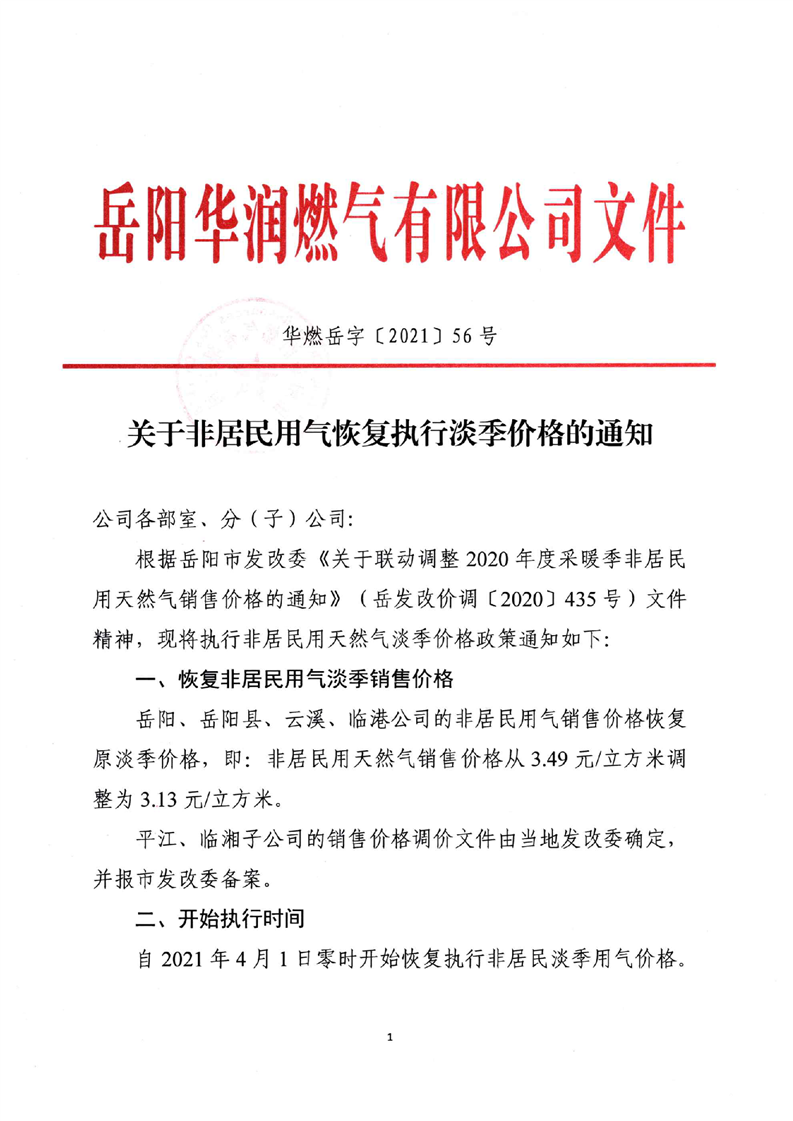 岳阳华润燃气有限公司关于非居民用气恢复执行淡季价格的通知