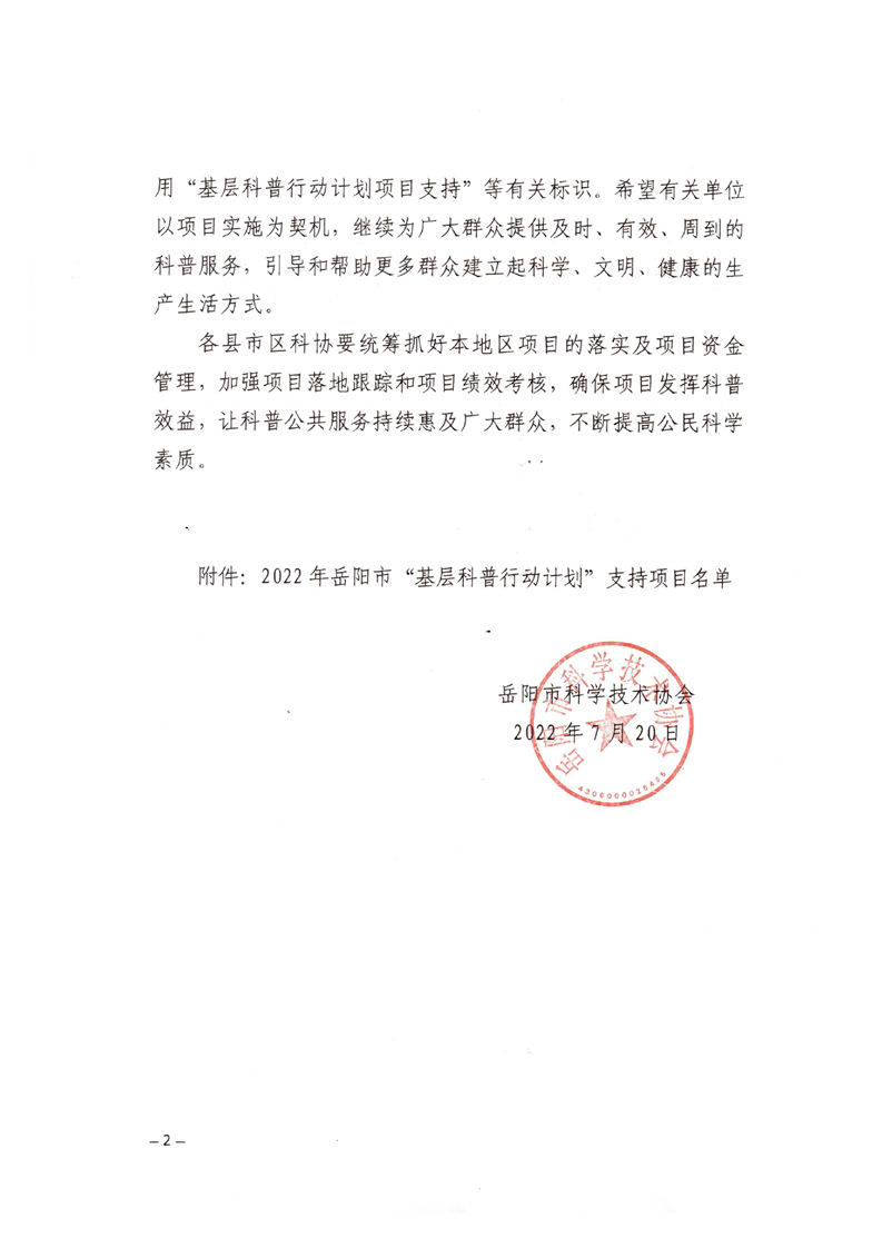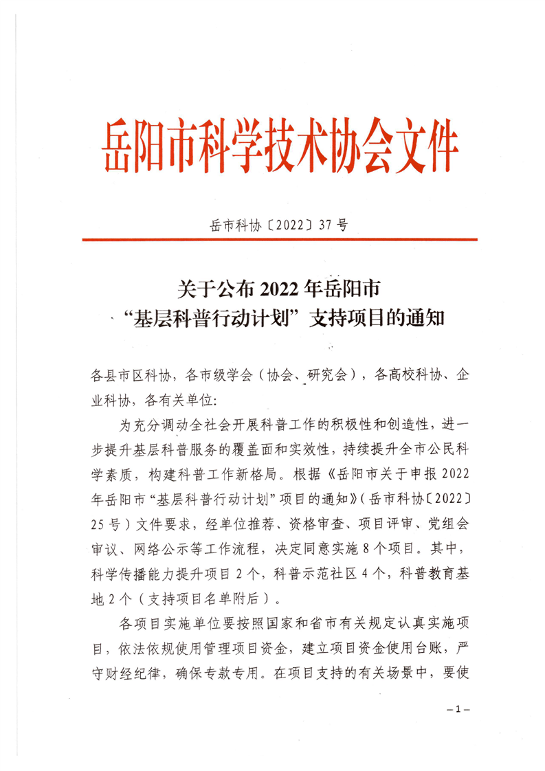 关于公布2022年岳阳市“基层科普行动计划”支持项目的通知