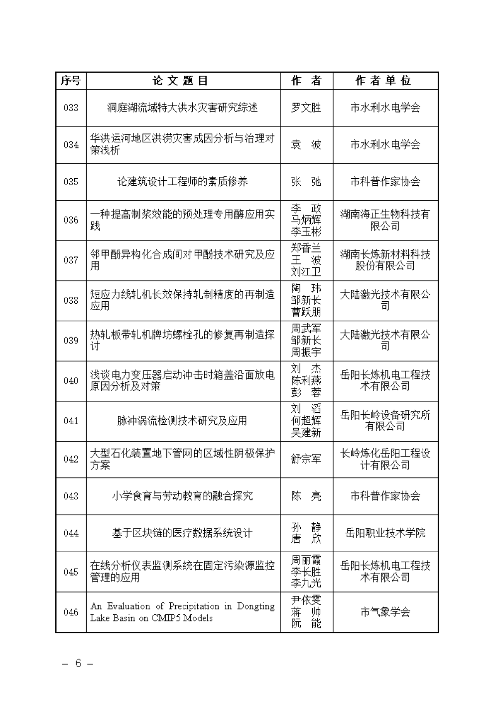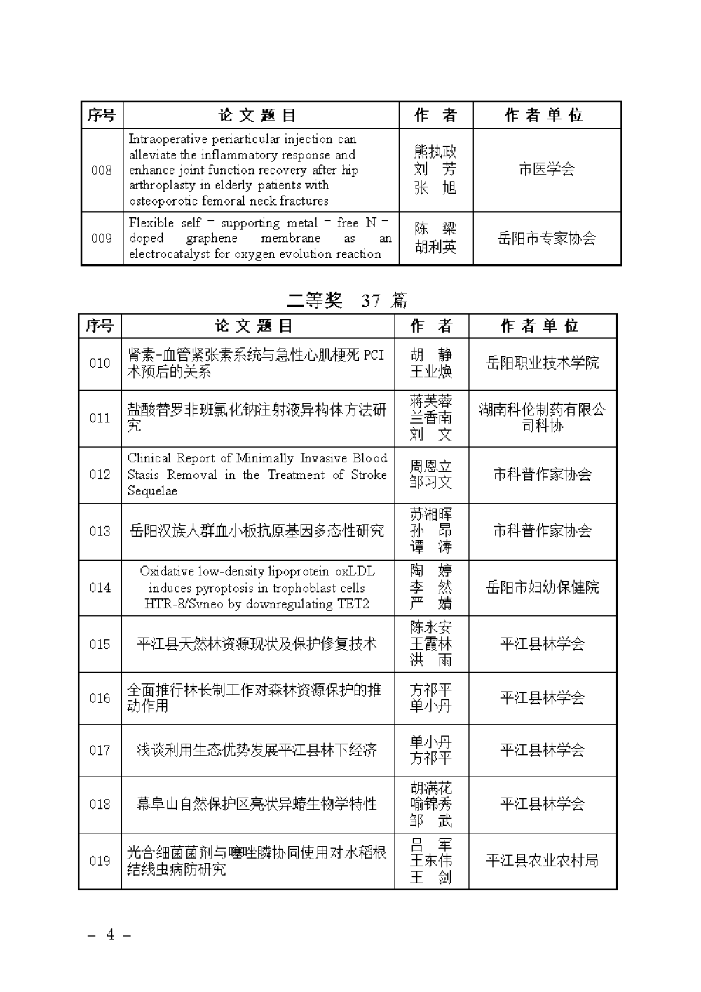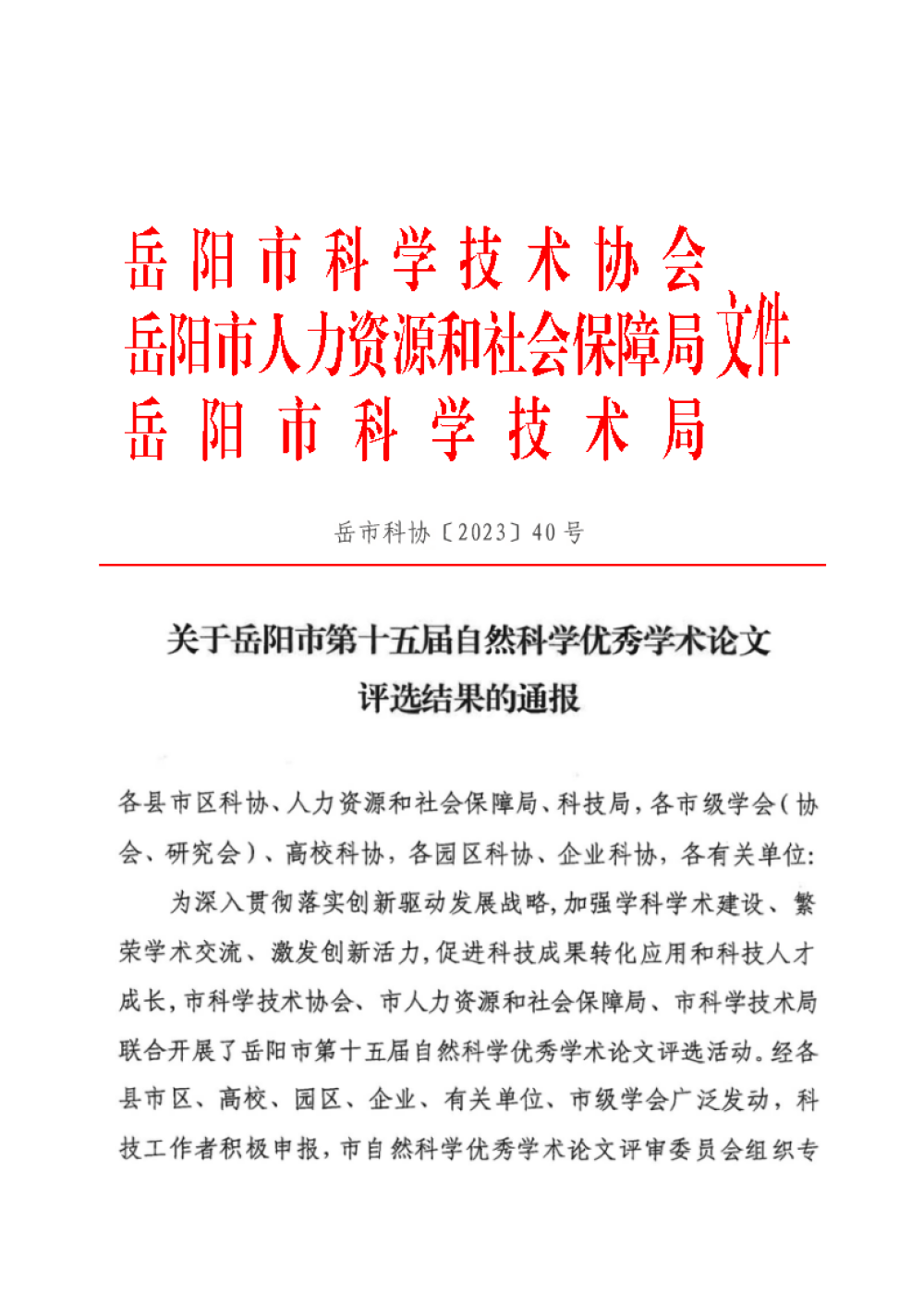 关于岳阳市第十五届自然科学优秀学术论文评选结果的通报