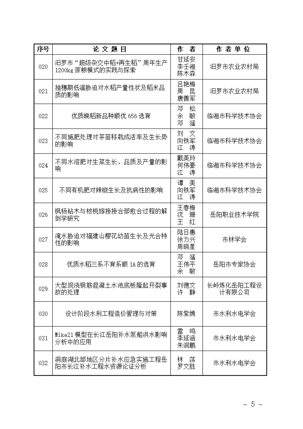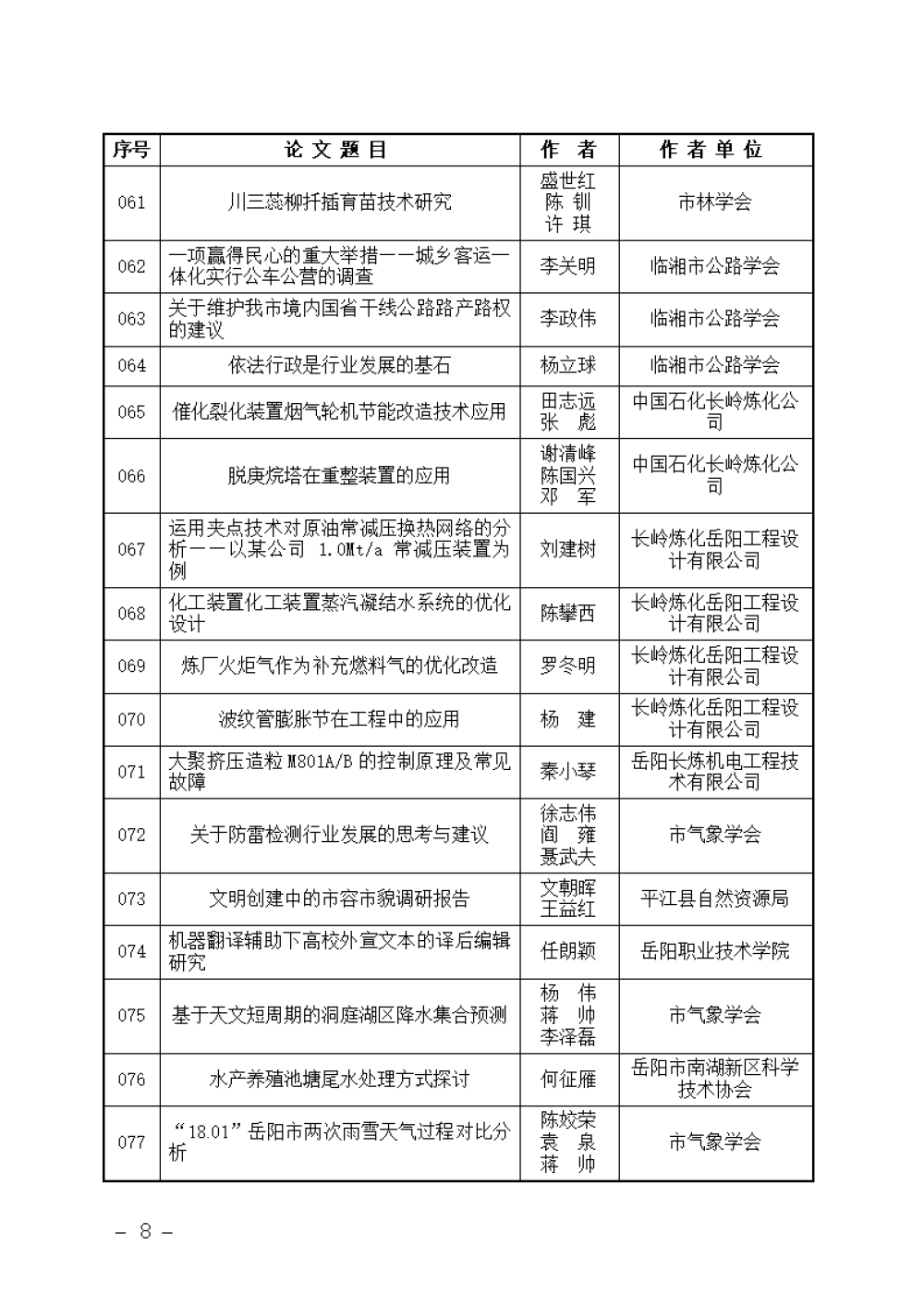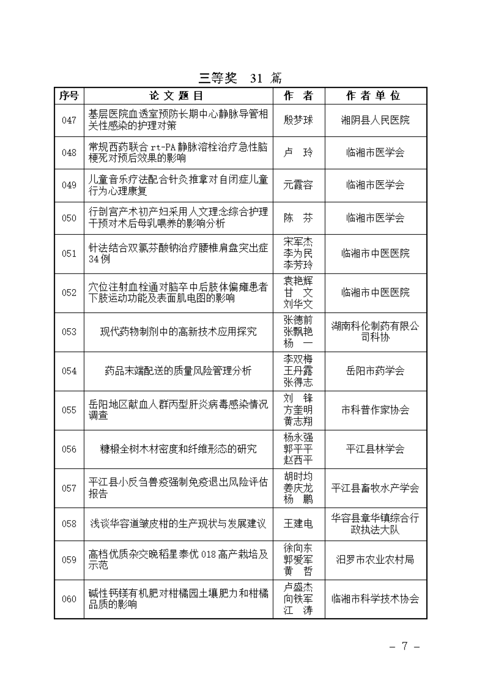 关于岳阳市第十五届自然科学优秀学术论文评选结果的通报