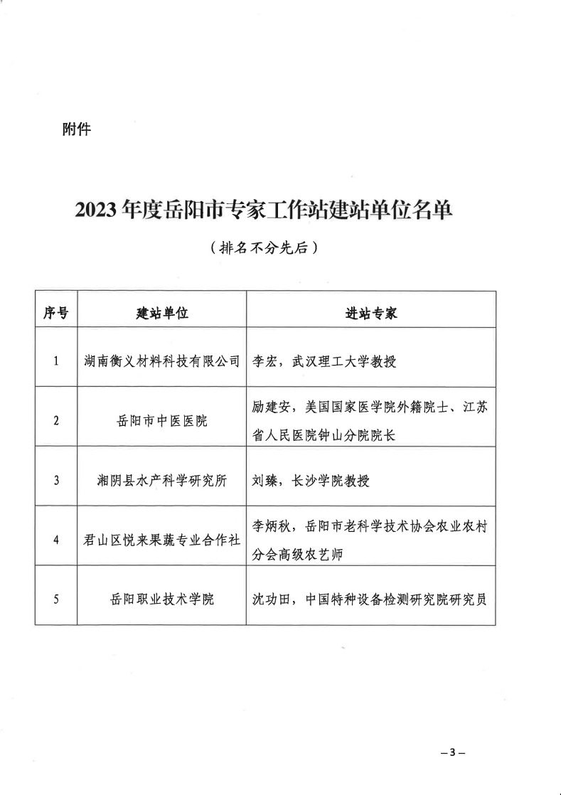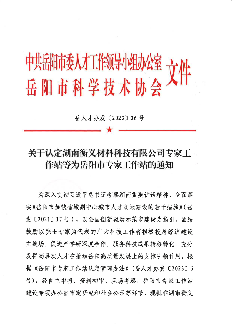 关于认定湖南衡义材料公司专家工作站等为岳阳市专家工作站的通知