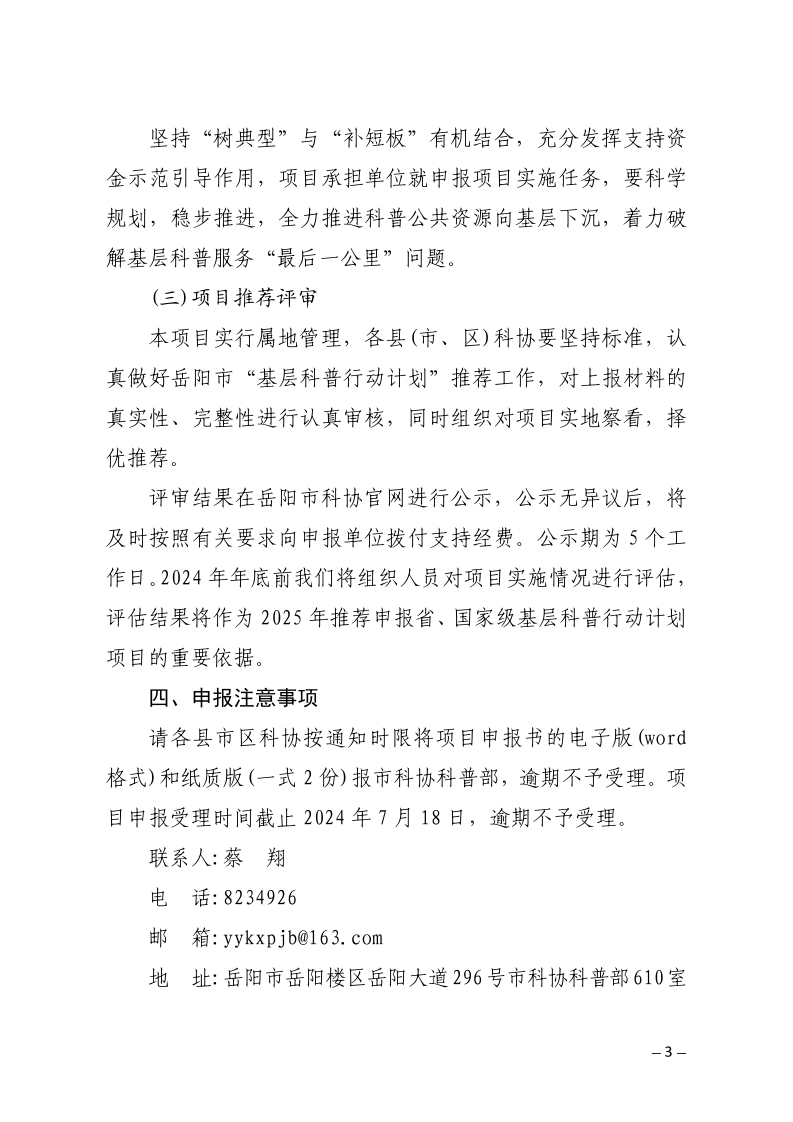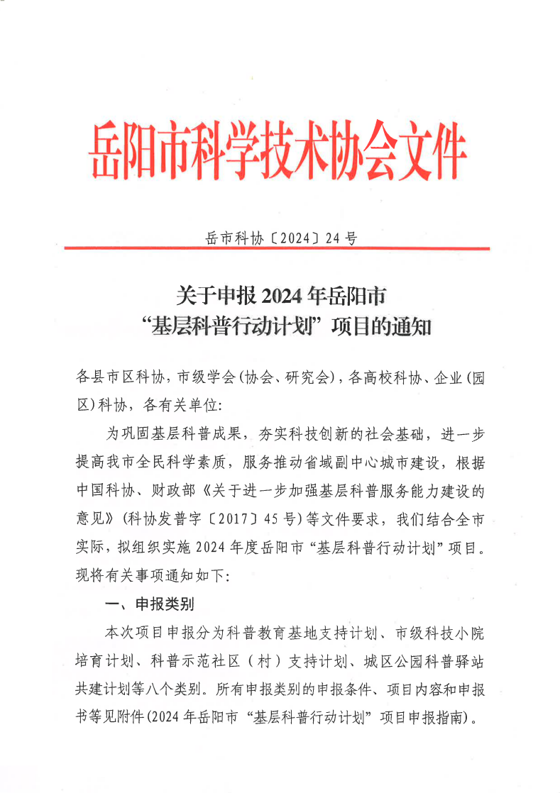 关于申报2024年岳阳市 “基层科普行动计划”项目的通知