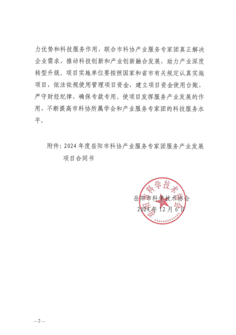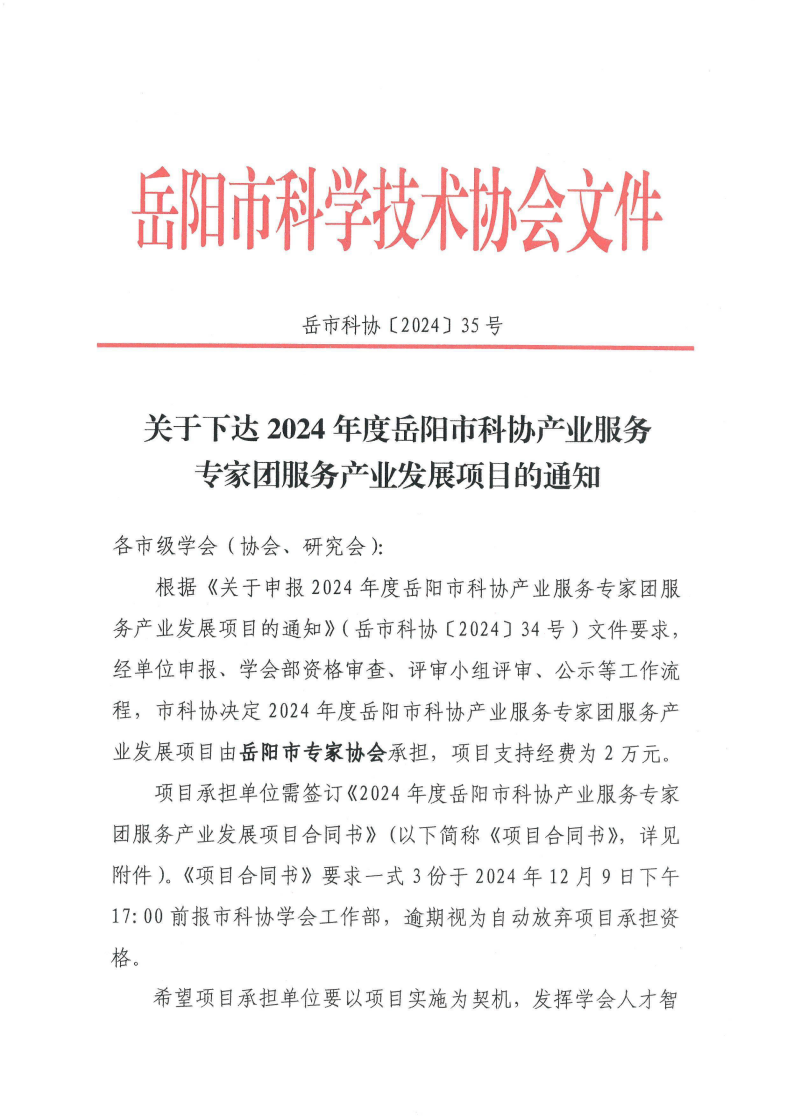 关于下达2024年度岳阳市科协产业服务专家团服务产业发展项目的通知