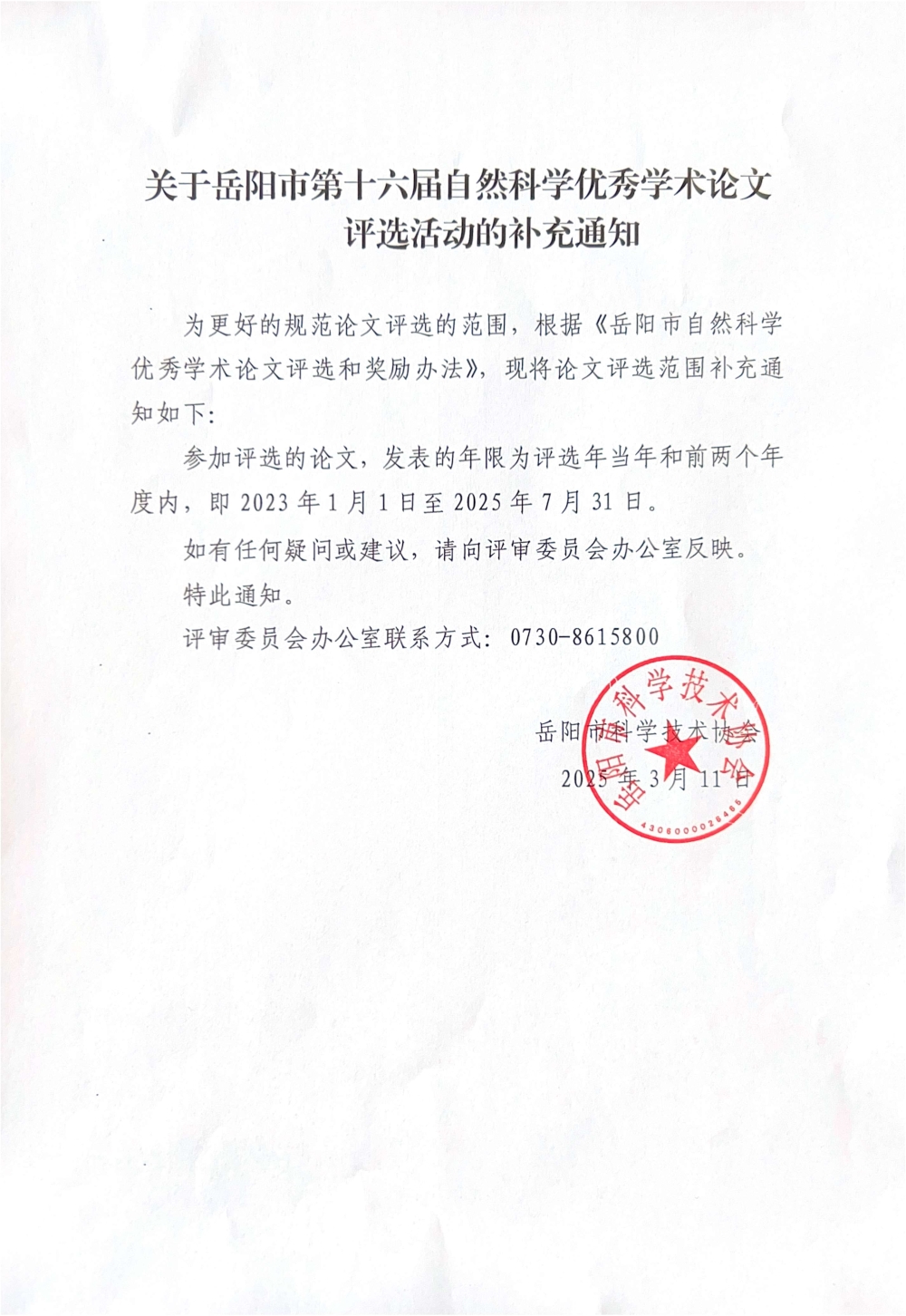 关于岳阳市第十六届自然科学优秀学术论文评选活动的补充通知