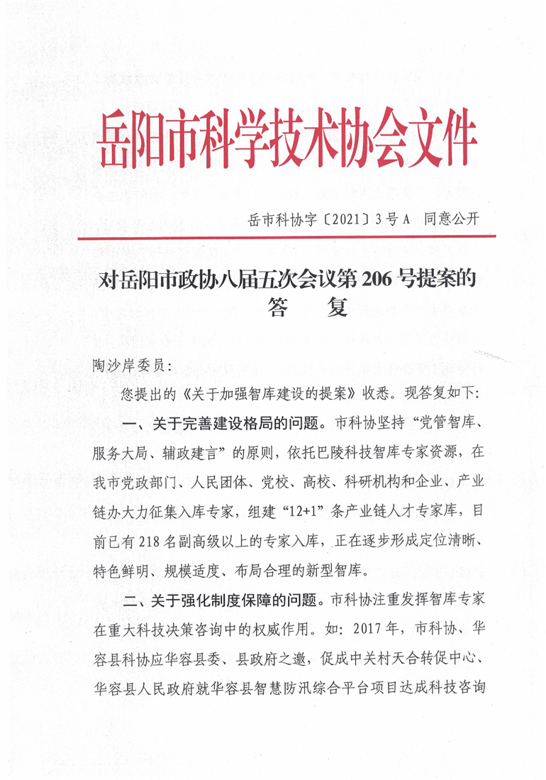 对岳阳市政协八届五次会议第206号提案的答复