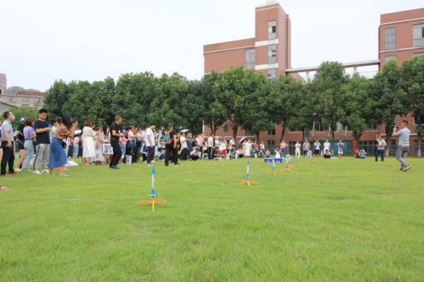 “3、 2、1 ”发射!随着一声口令,10余枚东风1号火箭模型直冲云霄,在蓝天上划出一道道美丽的弧线, 场面十分壮观,现场气氛高涨热烈,发出阵阵欢呼声。这是在岳阳市第十中学田径场上科技辅导员们在进行火箭模型发射训练的画面。