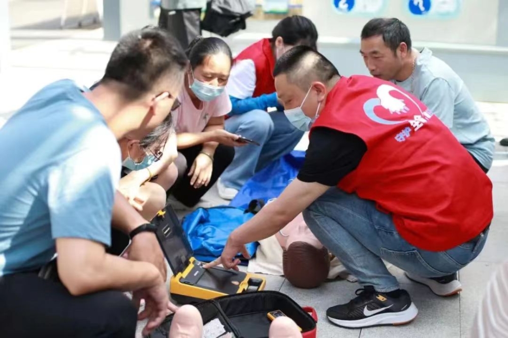 王家河公园健康科普驿站分为健康小屋和科普长廊2个区域。科技志愿者在现场开展志愿服务,培训操作演示区和义诊区人头攒动,市民边看边学,并在医护人员的指导下进行心肺复苏实操,现场气氛热烈。