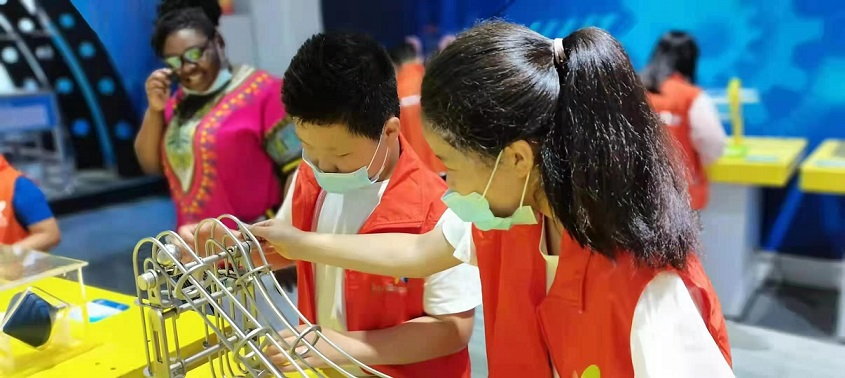“rocket,aircraft,fighter……”6月5日,科技馆前坪时不时传来了朗朗的英语声,场面十分热闹,原来是岳阳市詹姆斯培训学校的外教带领50余名孩子在为参观科技馆做准备。在科技辅导员的带领下,孩子们依次参观了航天航空展展厅,科…