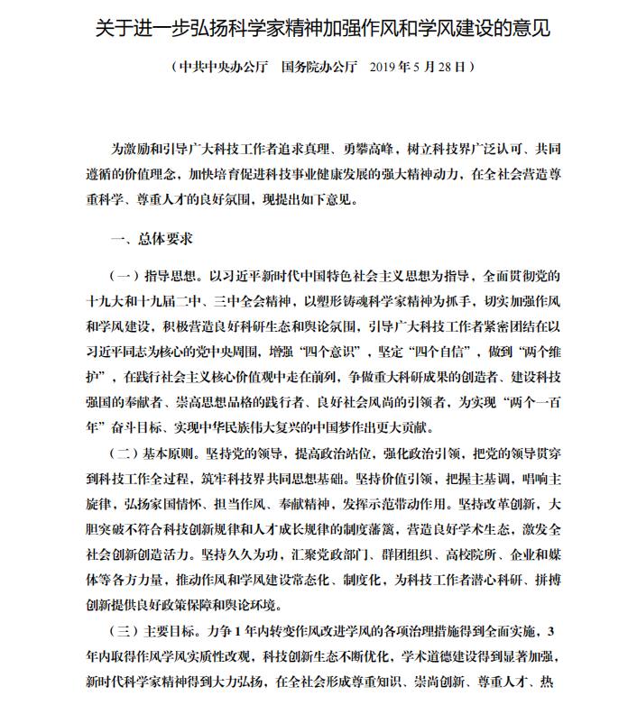 关于进一步弘扬科学家精神加强作风和学风建设的意见 (中共中央办公厅 国务院办公厅 2019年5月28日)