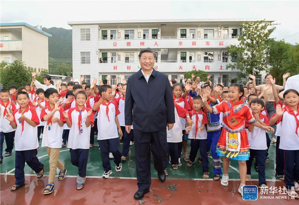 习近平接着来到文明瑶族乡第一片小学,走进厨房、储藏间,察看学生餐营养搭配和食品安全。四年级的同学们正在上思政课,看到总书记走进来,齐声向习爷爷问好。习近平对同学们说,你们今天是小树苗,将来要长成参天大树,中华民族伟大复兴的中国梦将在你们身上实现。希望同学们把红色基因传承好,好好学习知识和本领,努力成长为德智体美劳全面发展的社会主义建设者和接班人。各级党委和政府要关心关爱广大基层教师,落实好工资、社保、医疗、继续培训等各项政策。
