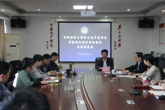 11月18日上午,岳阳市科协召开学习贯彻习近平总书记考察湖南重要讲话精神宣讲报告会暨党组理论学习中心组2020年第九次集中(扩大)学习,邀请市委宣传部常务副部长戴文慧作宣讲报告。市科协党组书记、副主席陶沙岸主持会议并讲话,市科协党组理论学习中心组成员,机关、事业单位全体党员干部参加学习。