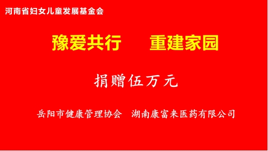 2021年7月20日以来,河南多地遭遇极端强降雨,郑州、新乡等地发生严重内涝,无数房屋倒塌,道路冲毁、停水断电,物质短缺,灾区河南人民的生活健康短时间内难以得到保障。得知情况的第一时间,岳阳市健康管理协会党支部迅速行动起来,积极向协会会员单位发出捐款捐物援助倡议。8月1日,协会会员单位湖南康福来医药有限公司以“健康的名义”,向河南灾区捐助伍万元用于灾区人民的灾后重建。