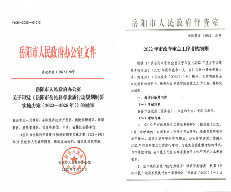近日,岳阳市人民政府督查室下发《2022年市政府重点工作考核细则》(岳政督函〔2022〕15号),将公民科学素质工作列入对县市区政府(管委会)落实2022年市政府重点工作考核内容。考核包含制定“十四五”全民科学素质工作具体实施办法及开展《科学素质纲要》宣讲活动等多项内容,采取扣分制予以考核。市政府督查室将分月或每季度对重点工作进行调查督查,根据重点工作完成情况,进行现场抽查核验。年初,公民科学素质工作已经纳入全市综合绩效考评,作为市政府重点工作考核,将进一步督促全市科学素质纲要实施工作有效落地。