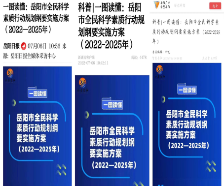 岳阳市委、市政府高度重视公民科学素质工作。今年6月,岳阳市人民政府办公室印发《岳阳市全民科学素质行动规划纲要实施方案(2022—2025年)》,着力实施青少年、农民、产业工人、老年人、领导干部和公务员科学素质提升行动等五项提升行动,开展科技资源科普化工程、科普信息化提升工程、科普基础设施建设工程、基层科普能力提升工程、科普人才队伍建设工程等五项重点工程。目前,围绕《纲要》实施工作,市政府已先后向市纲要办成员单位及县市区纲要办,开展两轮工作意见征求,召开全市科学素质行动规划纲要实施推进工作会,发放《纲要》宣传读本、宣传折页4000余份,进一步加强全民科学素质工作宣传力度,提高认识,夯实全民科学素质工作思想根基,层层抓好落实。
