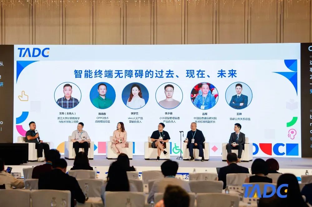 围绕“智能终端无障碍的过去、现在、未来”的议题,大会邀请到OPPO技术战略规划总监陈晓春、vivo人文产品营销负责人李梦竺、小米设备管理赛道产品负责人李少赓、中国信息通信研究院技术标准所副所长吕军、荣耀公共关系总监王帅和主持人浙江大学计算机科学与技术学院工程师王炜开展了圆桌对话。