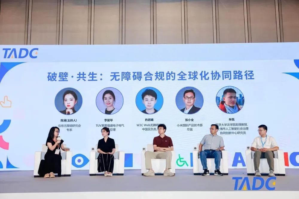 在《欧盟无障碍法案》临近生效的背景下,大会围绕“破壁·共生:无障碍合规的全球化协同路径”的议题,邀请到TUV莱茵福建电子电气副总经理李爱琴、W3C Web无障碍标准中国区负责人冉若曦、小米国际产品技术部总监张小全,同济大学法学院助理教授、上海市人工智能社会治理协同创新中心研究员朱悦和信息无障碍研究会专家陈澜展开了圆桌对谈。