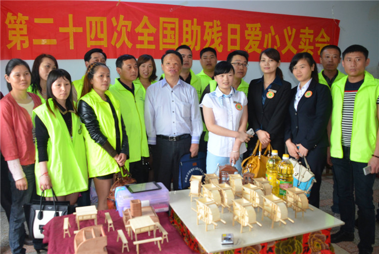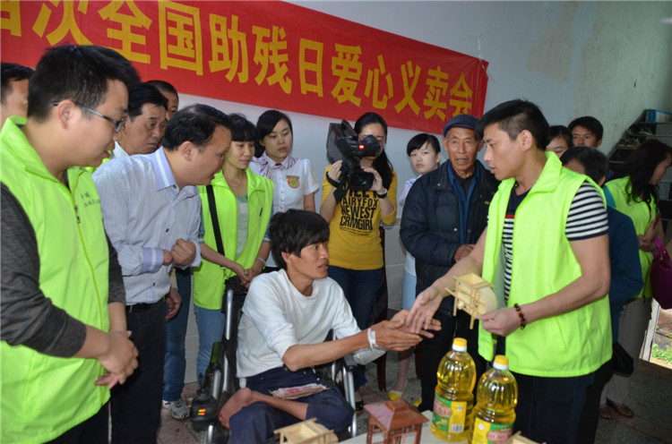 5月9日,省残疾人福利基金会岳阳市分会秘书长、岳阳市爱心助残志愿者协会会长姚平和市就业服务局城社科科长宋建明,与岳阳市龙根绿志愿者协会的志愿者、高鹏轩食府爱心助残志愿者一行30余人,冒雨1个多小时赶往方移飞家,在他简陋的家中举行了一场特殊的爱心助残义卖会,现场募集近万元的爱心资助款,作为第二十四次全国助残日的节日礼物赠送方移飞,并鼓励他早日就医、尽快大批量生产他的手工艺品,朝着自强创业、奔向小康的正确道路,勇敢地走下去。