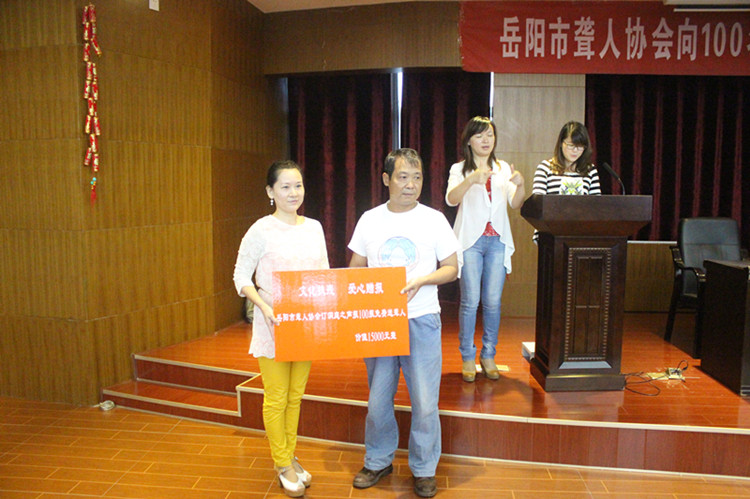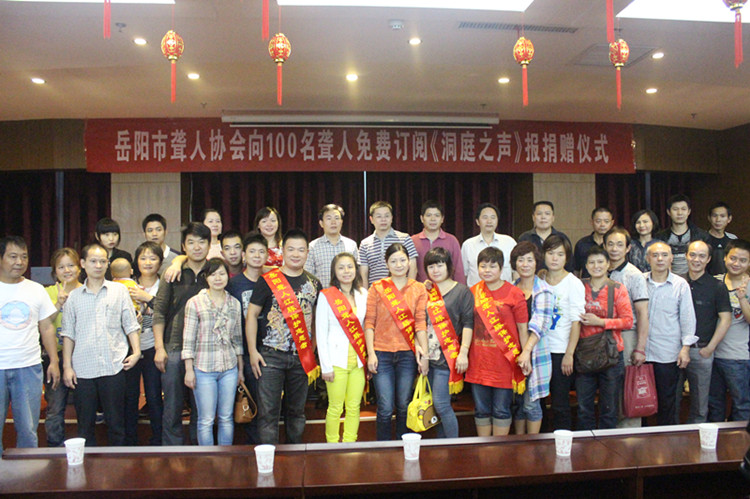 9月11日,岳阳市聋人协会在岳阳日报社举行捐赠仪式,免费向100名聋人捐赠100份2014年度《洞庭之声报》,总价值为15000元。湖南日报社岳阳记者站站长徐亚平、岳阳市残联副调研员巢向阳、岳阳日报社长助理、洞庭之声报社长沈勇、洞庭之声报常务副社长任永志、岳阳市残联办公室主任周荣鹿和岳阳楼区党组成员韩姝出席了捐赠仪式。