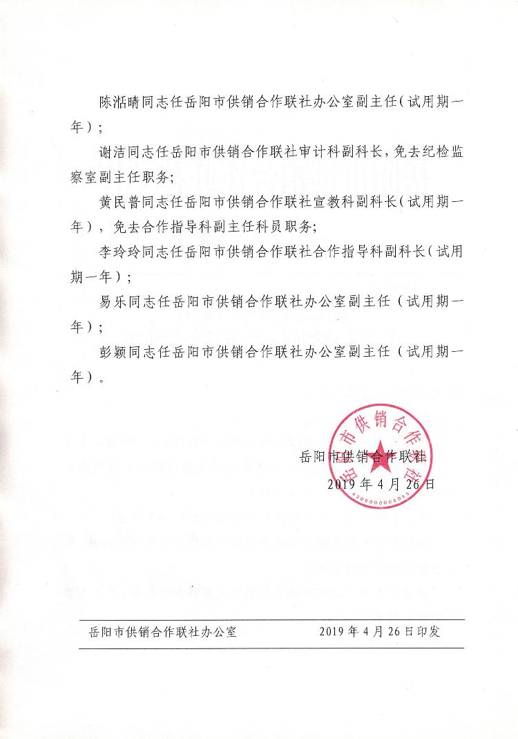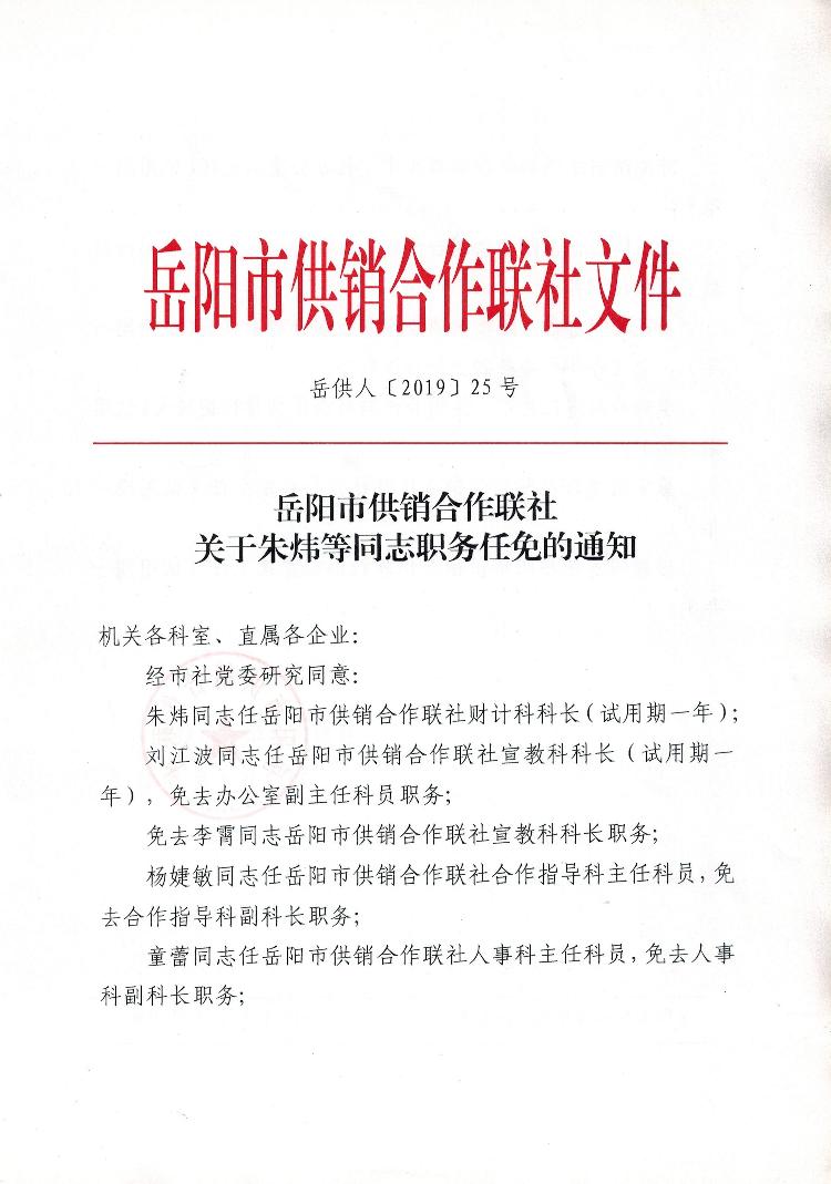 岳阳市供销合作联社关于朱炜等同志职务任免的通知(岳供人〔2019〕25号)